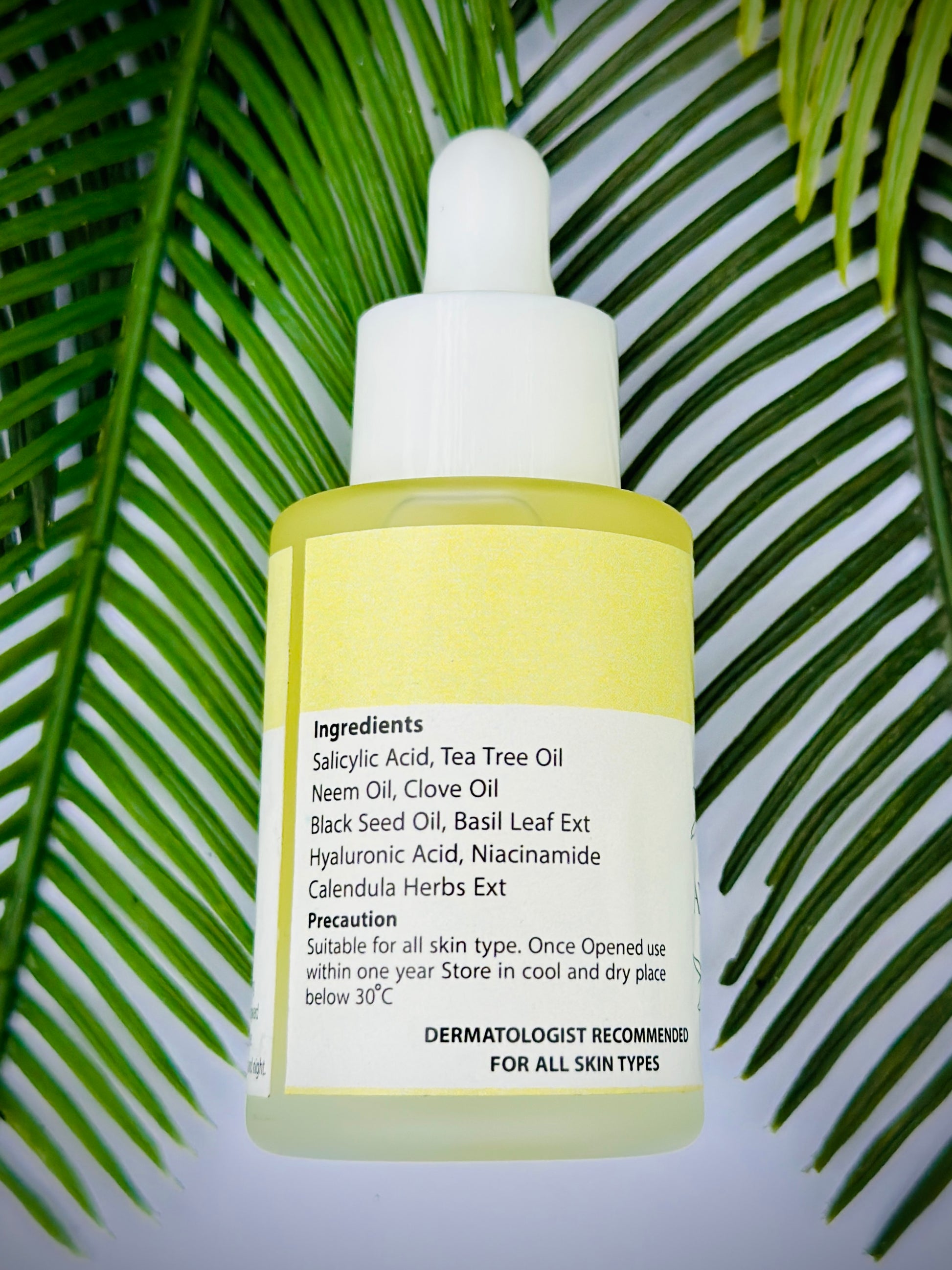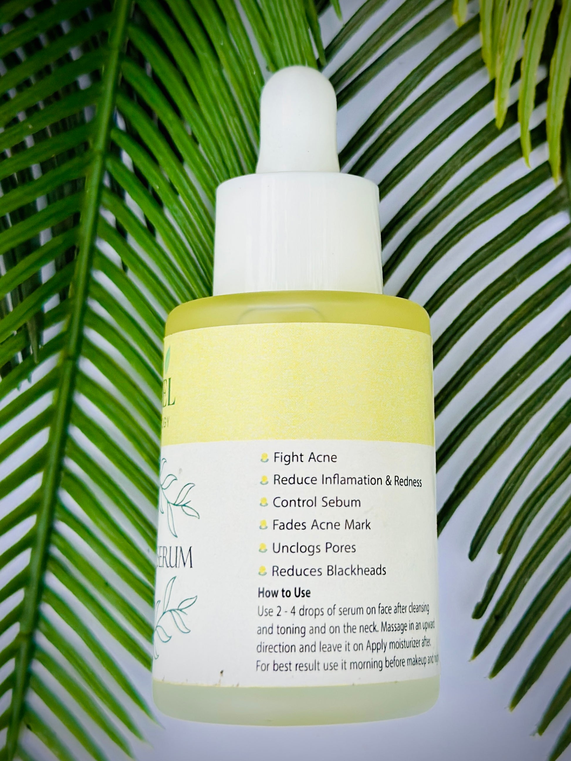 Nexcel Anti Acne Serum bottle with green leaves on a leafy background